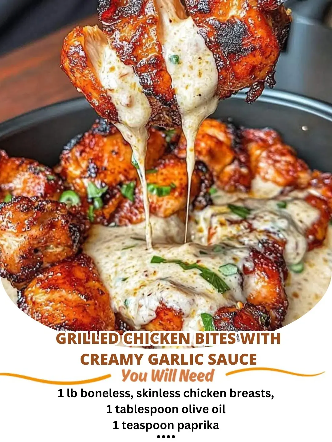 - Arrange the grilled chicken bites on a platter and drizzle with the creamy garlic sauce, or serve the sauce on the side for dipping.